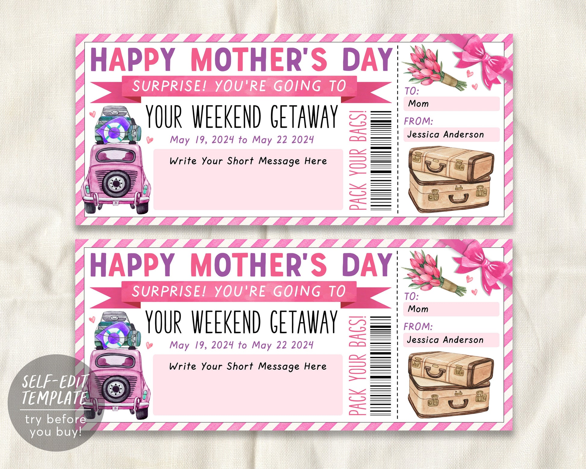 Mothers Day Weekend Getaway Voucher Editable Template, Surprise